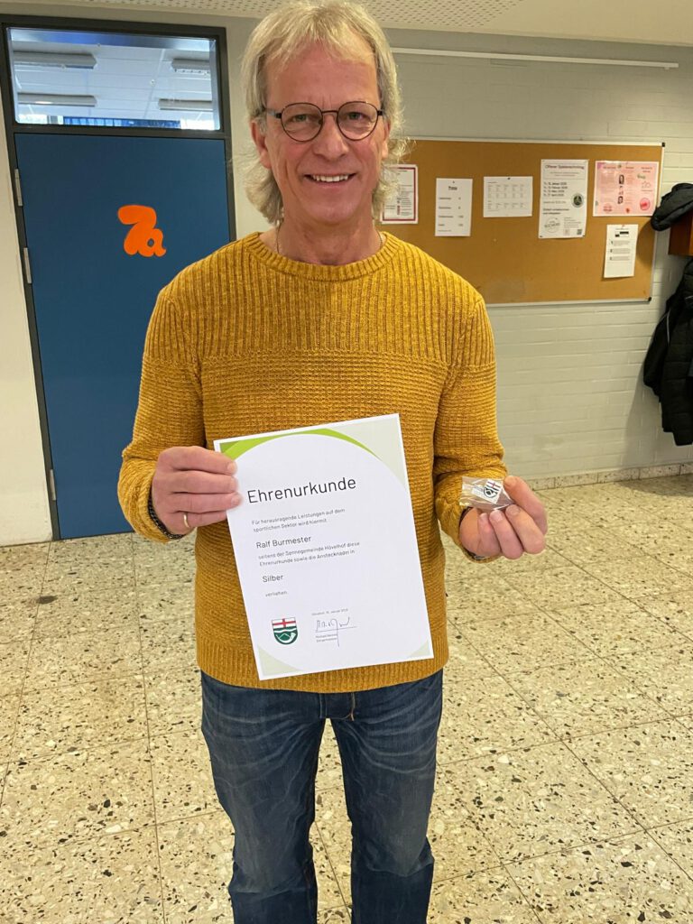 Die Gemeinde Hövelhof lud ihn daher zur Sportler*innen-Ehrung am vergangenen Sonntag ein. Dort durfte Ralf aus den Händen von Bürgermeister Michael Berens und Gemeindesportverbands-Vorsitzenden Heinz Thieschnieder die Anstecknadel und die Ehrenurkunde in Silber entgegennehmen. Herzlichen Glückwunsch auch dazu!!!